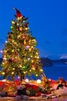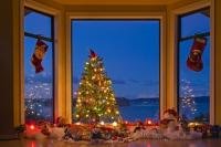 A typical Christmas scene with a decorated tree and stockings hanging in the window. The Christmas tree is surrounded...