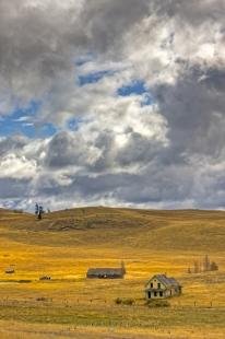 An old house and barn look exposed as they sit out in the middle of a field under a gathering of dramatic clouds in...