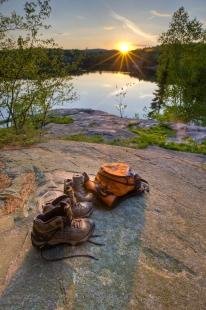 The sun settles on top of the forest clad banks of George Lake, a popular hiking spot in Killarney Provincial Park,...