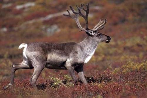 A Caribou stag of the Denali caribou herd grazes amongst the beautiful falls colours in the Denali National Park of Alaska in the USA.