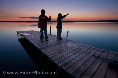 These children have spent some time fishing on Lake Audy in Riding Mountain National Park in Manitoba and they are showing off their catches proudly as the sun sets on the horizon behind them. The water of Lake Audy is as still as a mirror and the clouds along with the wharf are reflected clearly on the surface. Even the soft pink of the sunset has bathed the top of the lake in a pink glow before it turns to an inky darkness as full night falls.