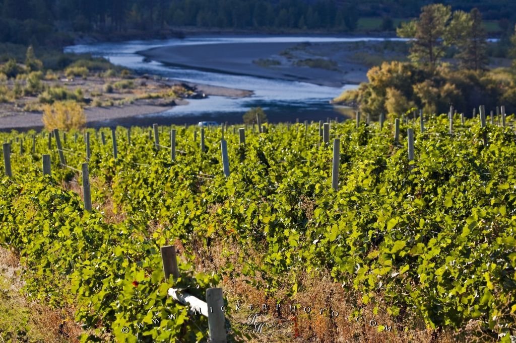 Rows of grapevines growing at a vineyard in the Similkameen River Valley along Highway 3 (Crowsnest Highway), Okanagan-Similkameen Region, Okanagan, British Columbia, Canada.