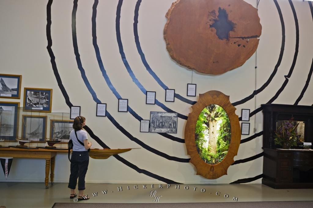 Wall display showing the size and ages of Kauri trees, Matakohe Kauri Museum, Matakohe, North Island, New Zealand.