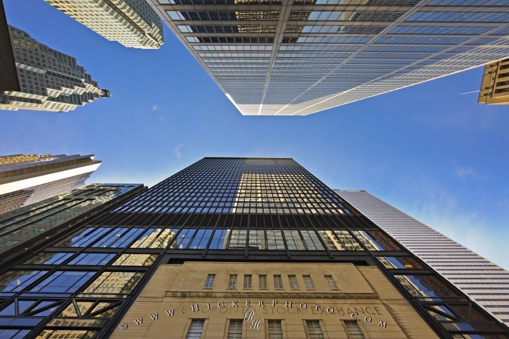 From the street level in the Financial District of downtown Toronto, Ontario you can look up towards the clouds until you see the tops of the high rise buildings. The sun sparkles off the windows on the high rise buildings creating a mass of reflections around the Financial District.