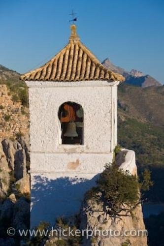 On the historic belfry near the Castle of Guadalest in the Province of Alicante in Comunidad Valenciana, Spain, a weather vane is situated on the very peak of the roof. The white washed belfry is from ancient years and through the open window, the white church bells hang from the roof.White washed church belfry beside the Castell de Guadalest, Castle of Guadalest, Guadalest, Costa Blanca, Province of Alicante, Comunidad Valenciana, Spain, Europe.
