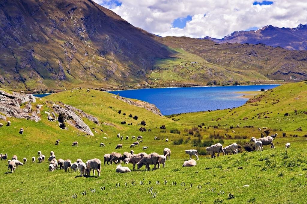 An image of lush green pastures, a flock of sheep and deep blue coloured lakes all backdropped by towering mountains; this is a scene which epitomizes New Zealand.