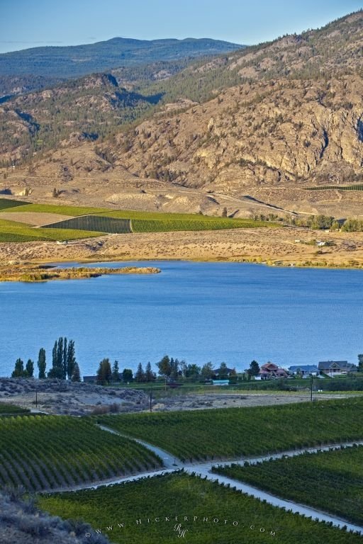 Landscape and vineyards lining Lake Osoyoos near the city of Osoyoos, Okanagan-Similkameen Region, Okanagan, British Columbia, Canada.