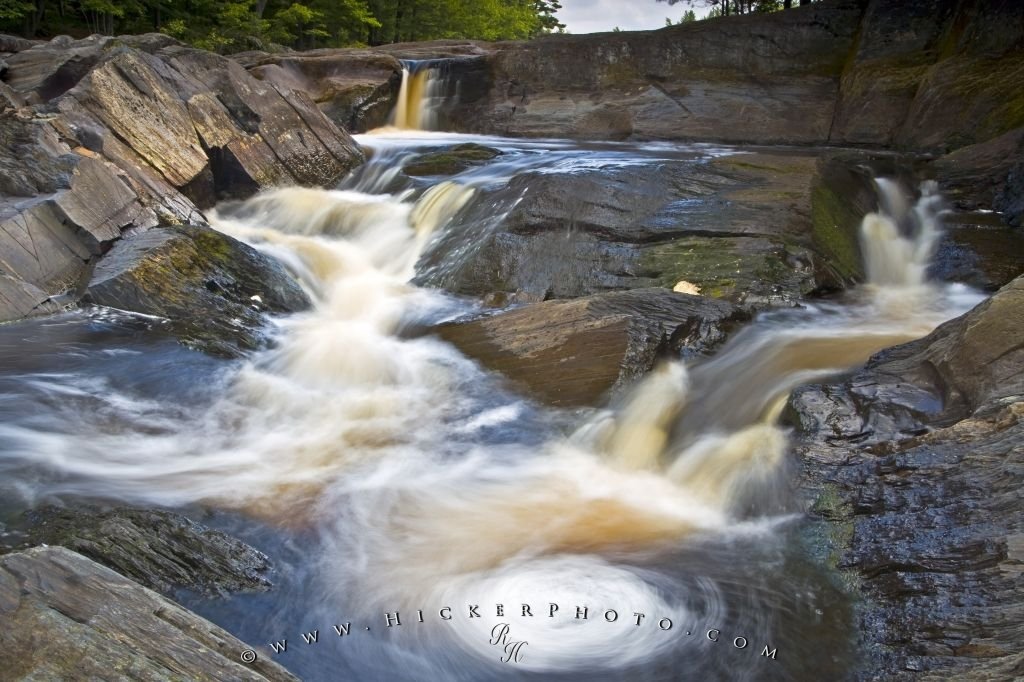 The cascading waters of Mill Falls, a waterfall in Kejimkujik National Park and National Historic Site in Nova Scotia, are located at the end of a 500 metre long trail (1 kilometre return) where the Mersey River rushes over ancient African slate rock.