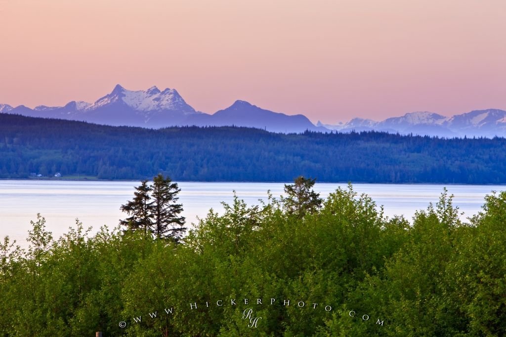 Mount Stevens is seen here at sunset and the rest of this stunning scenery is comprised of the Coastal Mountain Range and Malcolm Island in BC. This view is taken from Vancouver Island overlooking the Broughton Strait. The sunset has turned the sky a glorious soft pink colour and makes the mountain range look almost magical, as if it belongs in a fantasy world.