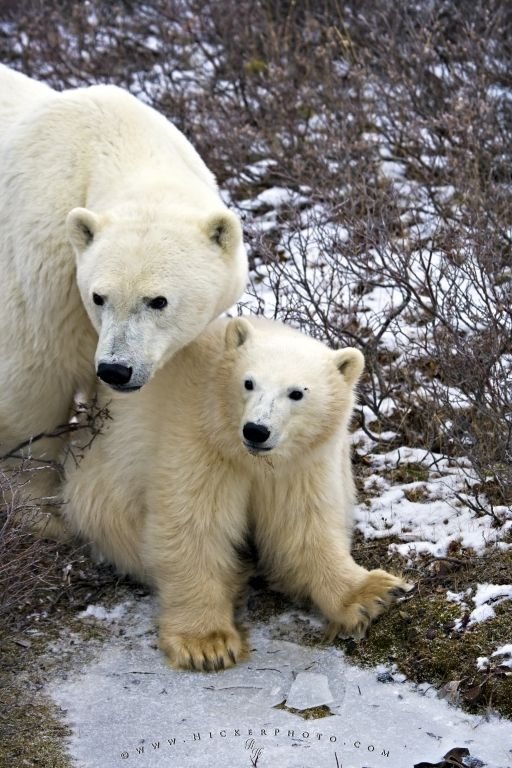 A mother Polar Bear watches very closely over her cub on the icy tundra in Churchill, Manitoba as we capture this family photo. Polar bears are massive, curious and very aggressive and can be very dangerous to humans especially when they are caring for a young family member.