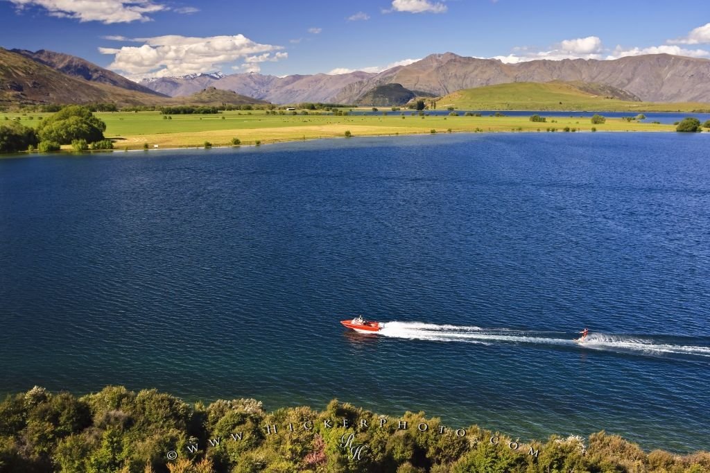 Waterskier on Lake Wanaka at Glendhu Bay, Central Otago, South Island, New Zealand.