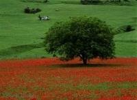 Panorama photo of Italian landscape with a single tree surrounded by a red poppy field in Apulia, Italy.